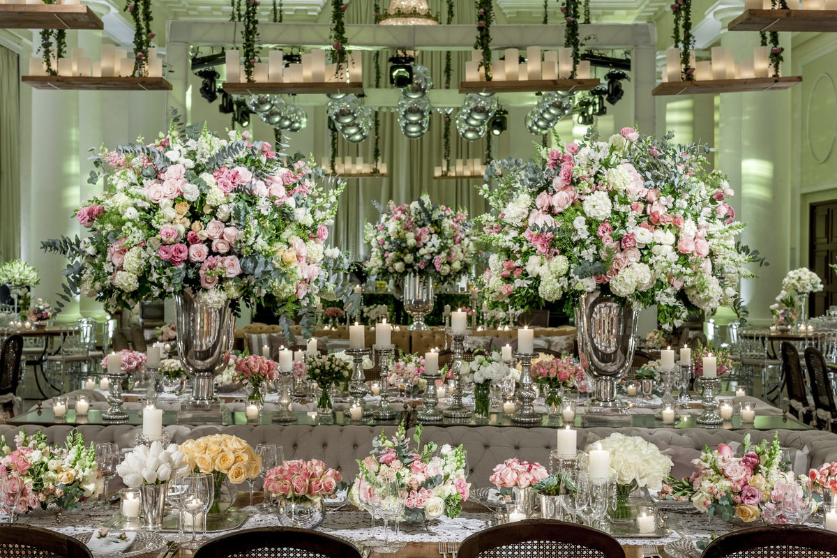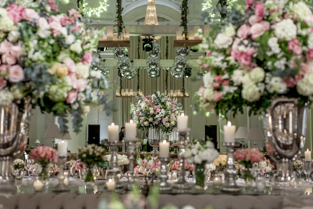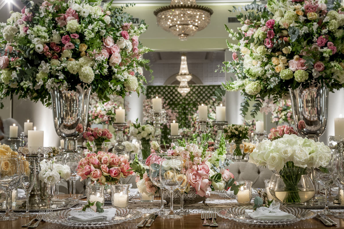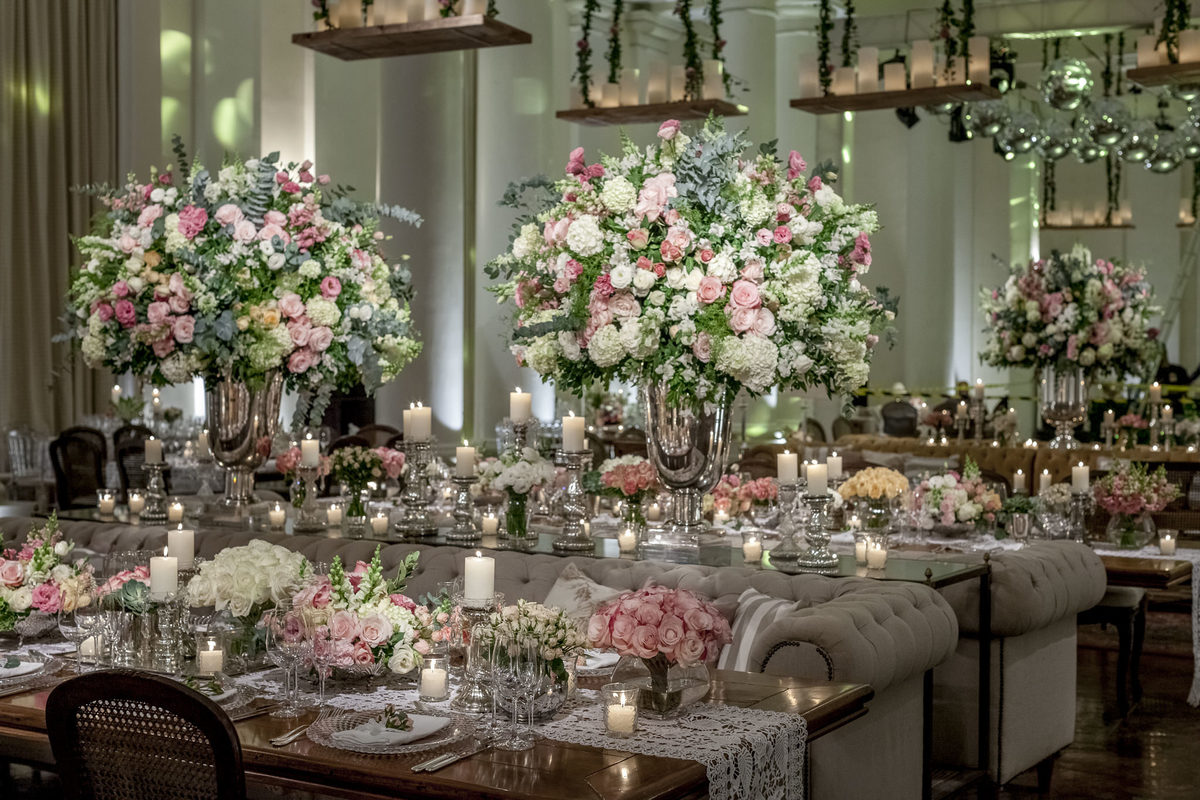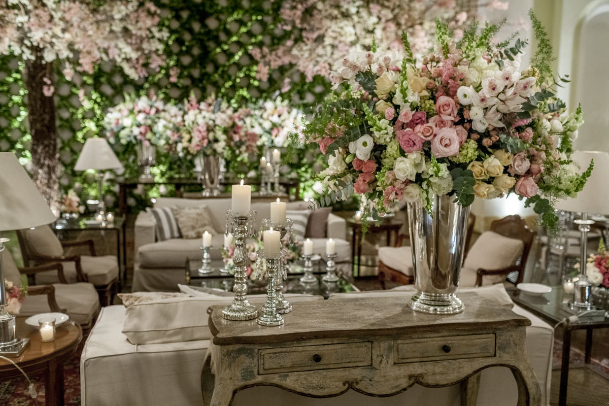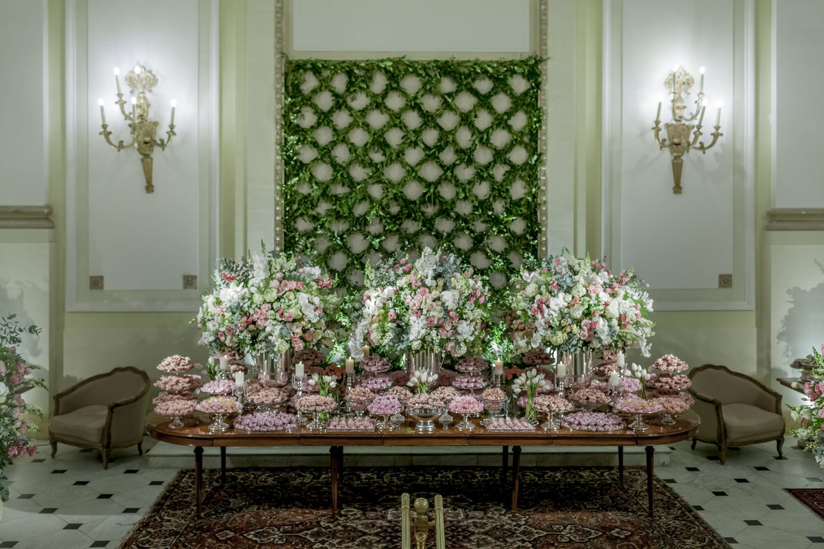 Muitas prateleiras penduradas pelos salões do hotel Copacabana Palace com luminárias de velas formavam um céu de luzes juntamente com imenso jardim florido em tons pasteis nas cores rosa, chá, branco e verde. Treliças com eras emolduravam as mesas de bolo, doces e salão.